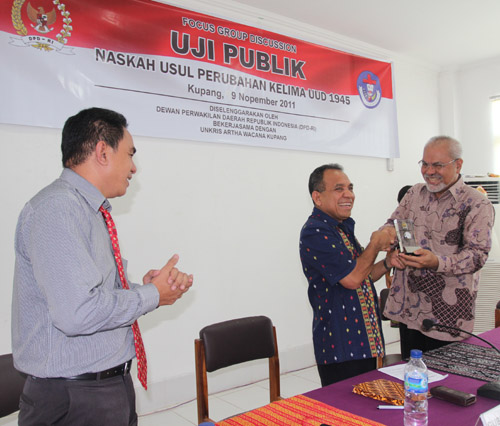 sergapntt.com [KUPANG] – Gubernur NTT, Drs. Frans Lebu Raya meminta kalangan Dewan Perwakilan Daerah (DPD) RI untuk cermat, obyektif dan konsisten dalam melakukan amandemen terhadap UUD 1945. “Perkenankan saya berikan masukan kepada DPD RI agar cermat, obyektif dan konsisten dalam amandemen UUD 1945,” tandas Gubernur saat membuka acara Focus Group Disccussion (FGD), di Aula Universitas Kristen Artha Wacana Kupang, Rabu (9/11/11).
