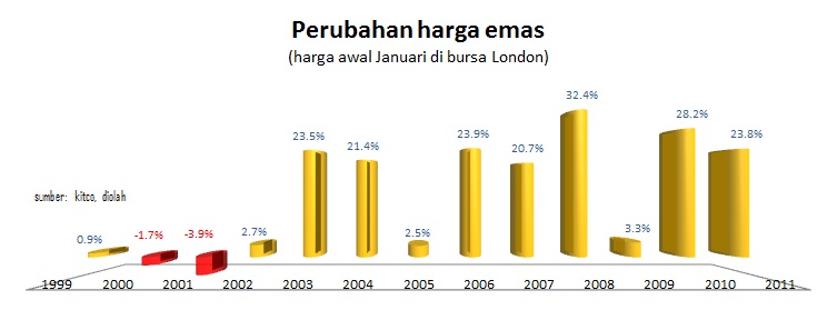 Namun, rata-rata kenaikan tahunan itu pun tidak selalu besar. Di bursa London, sepanjang tahun 2000-2001, perubahan harga emas malah negatif (-1,7 persen dan -3,9 persen). Atau, pada tahun 2005 dan 2009, kenaikan tahunannya cuma tiga persen.