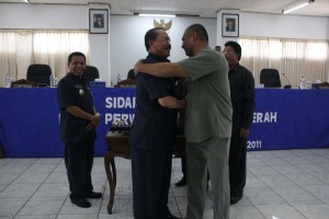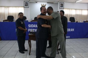 Walikota Kupang, Drs. Daniel Adoe dan Ketua DPRD Kota Kupang, Viktor Lerik, SE akhirnya berdamai, setelah hampir dua tahun berseteru lantaran ketua dewan yang akrab disapa Veki itu dinilai terlalu keras mengkritisi pemerintah. Berikut foto-foto mereka saat berpelukan, saling memafaafkan di ruang sidang utama DPRD KOta Kupang belum lama ini: