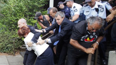 Gillard dan pemimpin oposisi Tony Abbott sedang ambil bagian dalam acara Hari Nasional Australia di sebuah restoran di ibukota Australia, Canberra, ketika sekitar 500 orang Aborijin mengepung gedung tersebut.